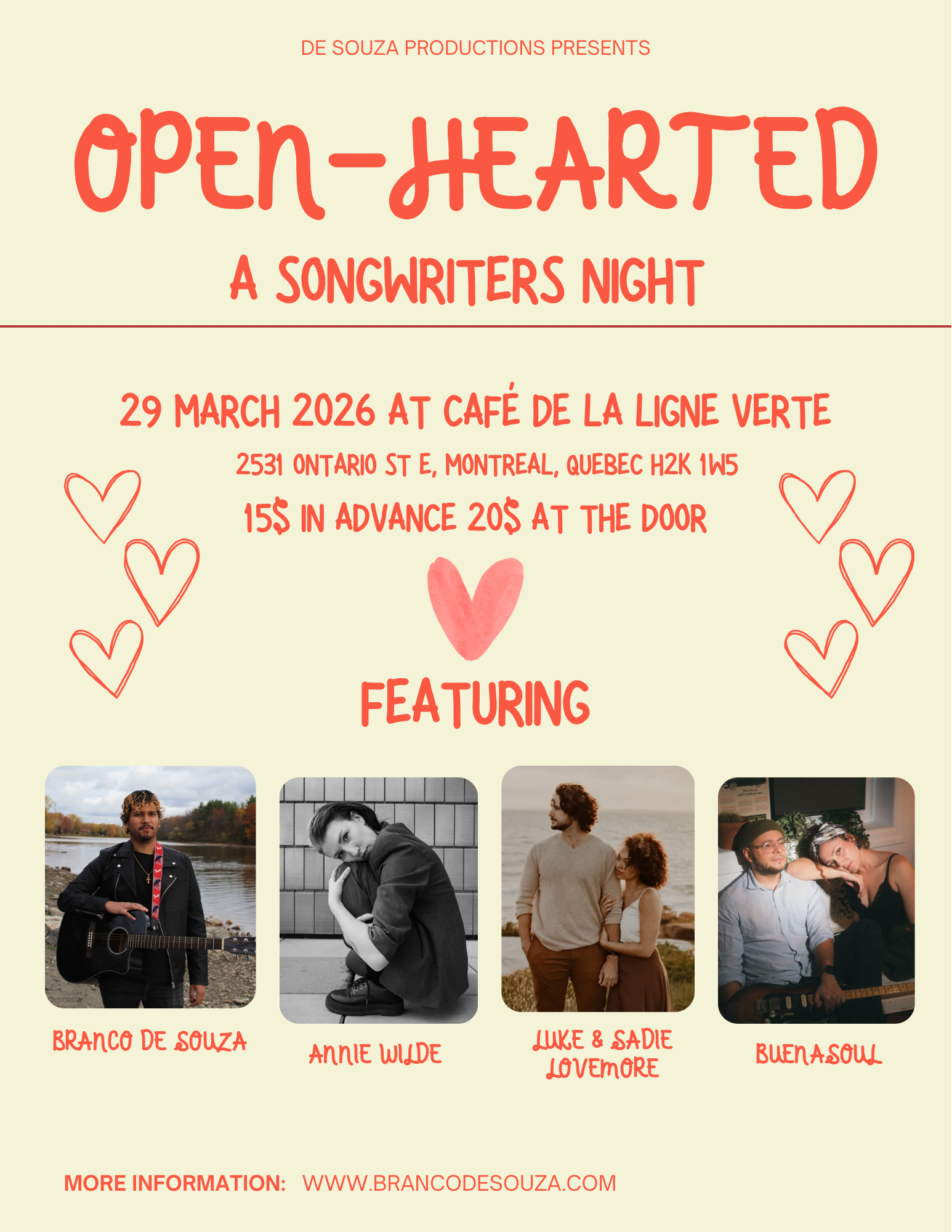 Open-Hearted brings together four distinct performances, each offering their own blend of vulnerability, passion, and artistry in a warm, up-close setting designed for true music lovers.